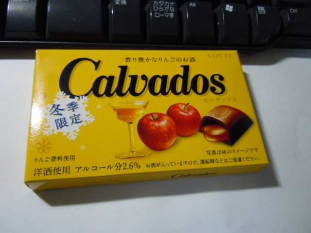 ロッテから2016年12月13日新発売。チョコの中にカルヴァドス(ノルマンディー地方で作られるりんごの蒸留酒)が入ってます。同じロッテの冬季限定のコニャック入りチョコ「バッカス」も冬になるとよく食べてました。