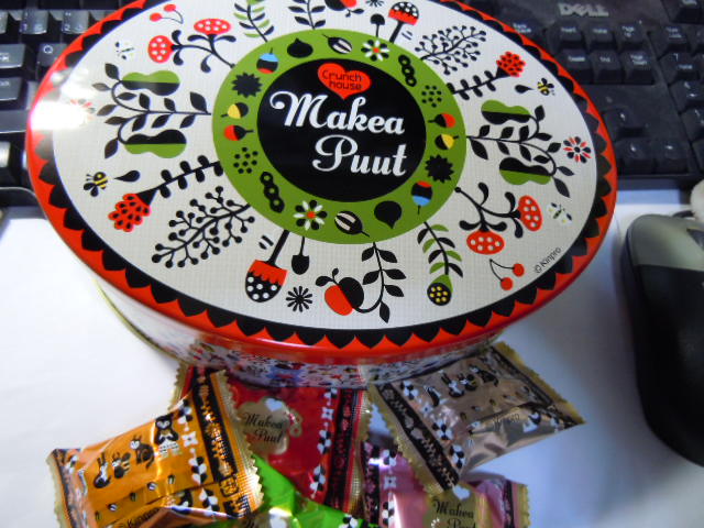 メリーのハロウィン菓子?ムーミンシリーズ。ムーミンの包み紙はライスパフ入りチョコレート、ミィの包み紙にはキャラメルチョコレートが入っていました。缶がかわいいw
