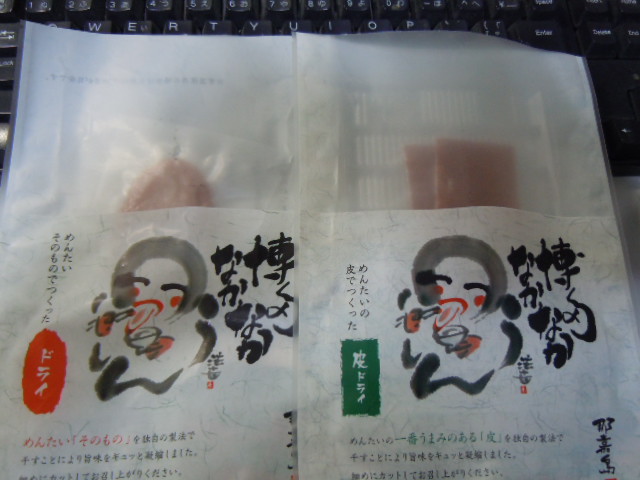 長男のお土産。乾燥辛子明太子です。ドライ明太子とドライ明太子皮。皮だけ干すってどんな発想かと。