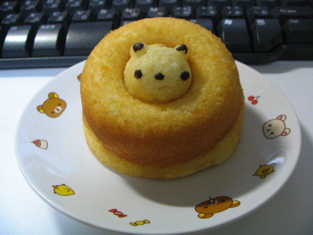 北海道・シレトコファクトリー。焼きドーナツです。中心の穴の中からクマさん(だと思ってる)がにょきり。