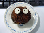表面にココアパウダーとスプレーチョコをまぶして、ホワイトチョコの目をつけるだけでまっくろくろすけに見えます。かわいいなぁ。