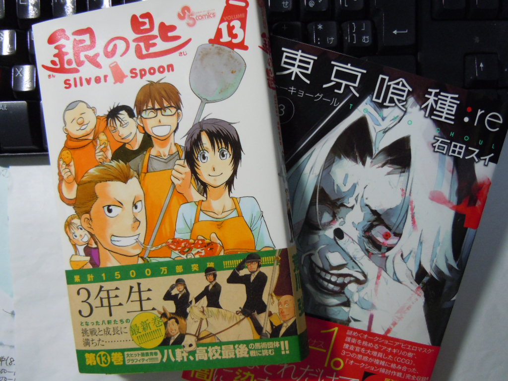 「銀の匙13巻」「東京喰種:re3巻」。銀の匙はそろそろ終わっちゃうのでしょうか、3年生だしなぁ。トーキョーグールの方は以前に週刊少年ジャンプに出張掲載されてた番外編が収められていました。