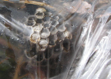 家の中に飛んで逃げましたが、なんか大丈夫かな?と思い軍手越しに巣をむしりとり、即ゴミ袋に投入しました。袋を3重にしてしばらくして見てみると5匹位ハチが袋の中にいました。あんまり住んでなかったんや!と思ってましたが・・・!