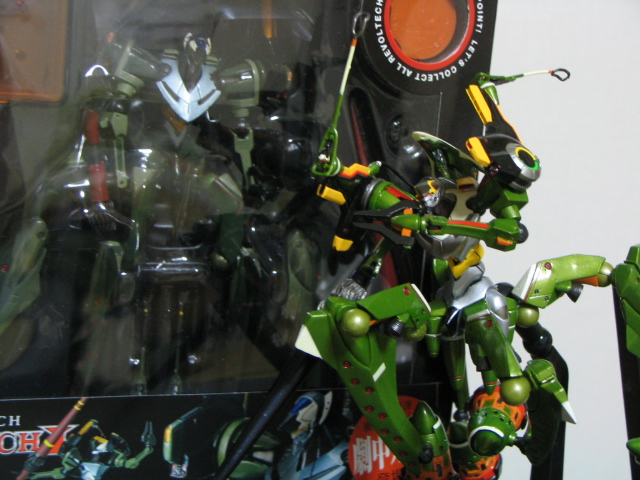 左後方の箱に入ったままなのが劇場版・破の劇中カラーVer.で右手前でポーズとってるのが、劇場版・破の公開前に設定資料に基づいて作られたVer.です。