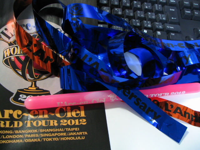 でも、前の席だったのでロゴ入り紙テープ(紙じゃないけど)も届いたし、ギターのkenちゃんが投げたペットボトルの水も被りました(笑)
