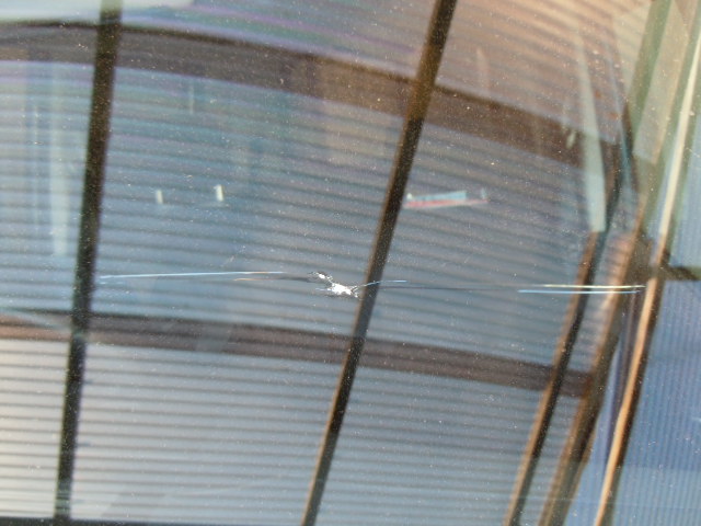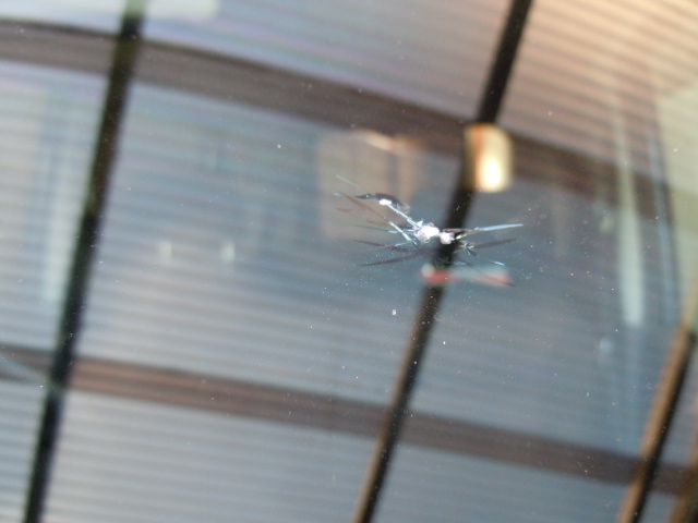 走行中に「ガンッッ!!」と大きな音とともに車体に振動もあったので、銃撃でもされたのかと思ったら、助手席にいた次男が前方を走行中のトラックからゴルフボールくらいの大きさの石が飛んでくるのを見たとのこと。「オレ、死ぬかと思ったわ」というくらいちょうど次男の顔の位置くらいのフロントガラスに3~4センチのひびが入ってました。